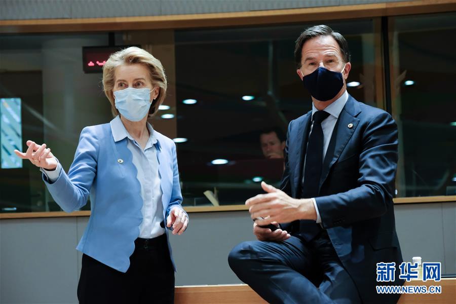7月20日,在比利时布鲁塞尔的欧盟总部,欧盟委员会主席冯德莱恩(左)与荷兰首相吕特在欧盟峰会前交谈。