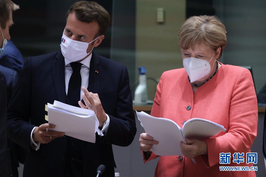 7月20日,在比利时布鲁塞尔的欧盟总部,法国总统马克龙(左)和德国总理默克尔准备出席欧盟峰会。 新华社发(欧盟供图)