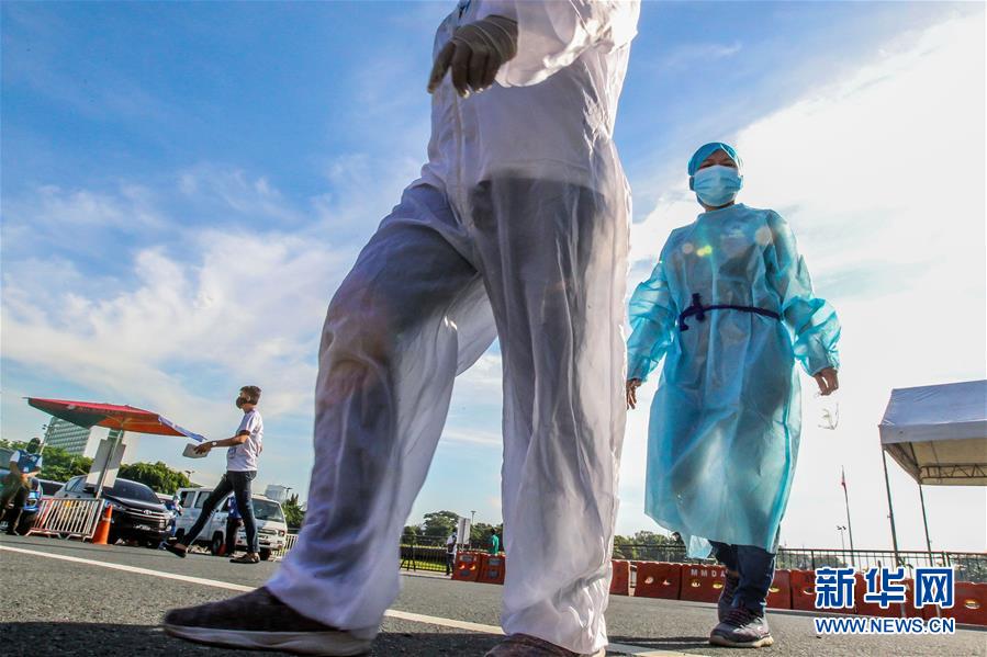7月21日,医护人员在菲律宾马尼拉一处“得来速”式新冠病毒检测点工作。 菲律宾卫生部21日通报,截至当地时间16时,该国新增新冠确诊病例1951例,累计确诊70764例。 新华社发(乌马利 摄)