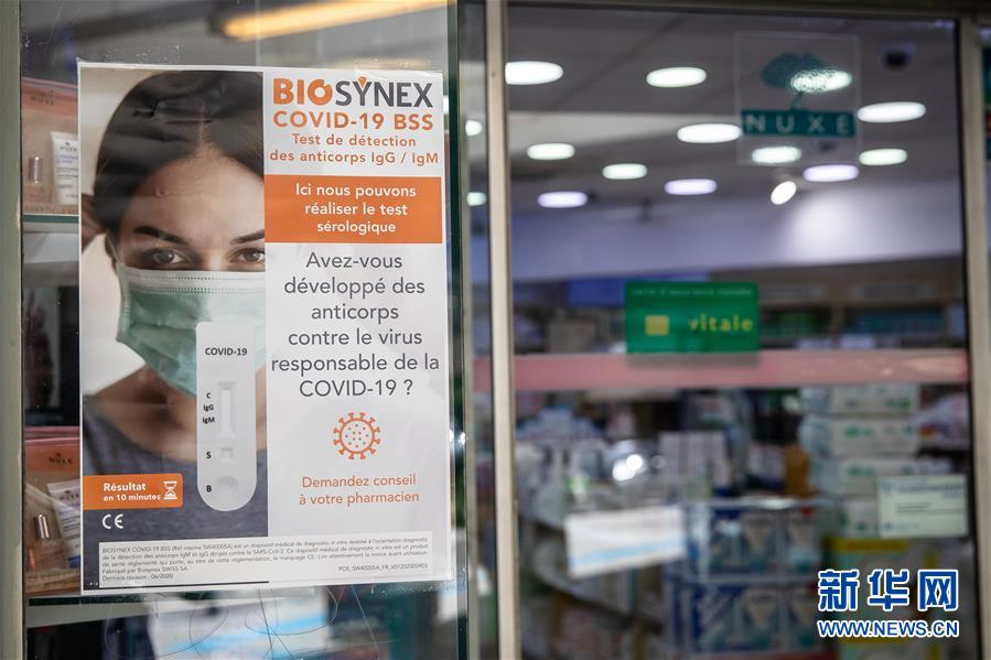 7月20日,法国巴黎一家药店的门上贴着快速检测新冠病毒抗体的广告。
