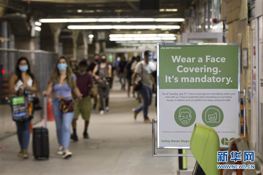 7月21日,在加拿大安大略省多伦多,乘客戴口罩进站。 当日,安大略省城际交通开始实施强制戴口罩措施,要求乘客全程戴口罩乘车。 新华社发(邹峥摄)