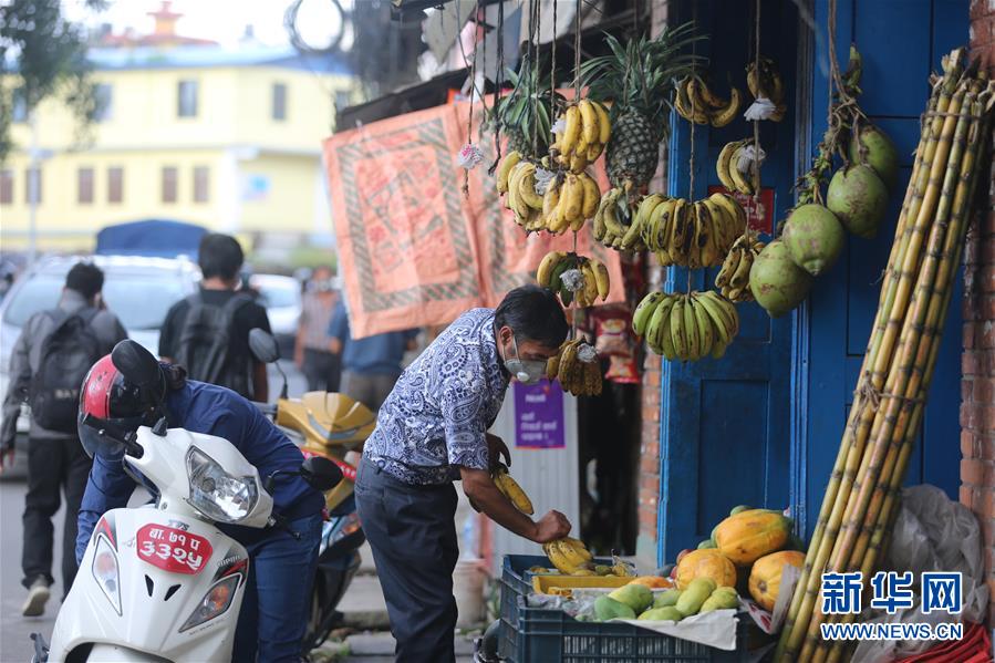 7月22日,一名男子在位于尼泊尔加德满都的一个水果摊前整理香蕉。 尼泊尔政府21日宣布,自22日零时起结束因新冠疫情而实施的全国封锁措施。目前,尼境内新冠疫情出现放缓迹象。据尼卫生与人口部21日公布的最新数据,过去24小时,全国新增确诊病例150例,确诊病例总数达17994例。为防范新冠疫情蔓延,尼政府从3月24日开始实施全国封锁。 新华社记者 周盛平 摄