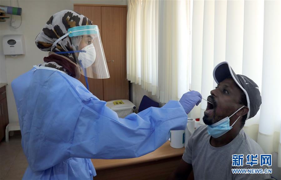 7月22日,医护人员在以色列中部城市奥尔耶胡达的一处新冠病毒检测站进行检测采样。 以色列卫生部22日公布该国判断新冠病例治愈的新标准,新标准将缩短确诊病例的隔离期,有助于节省病毒检测资源和减轻医疗系统的压力。以卫生部22日报告新增确诊病例2043例,创疫情暴发以来的单日新增病例数新高。 新华社/基尼图片社