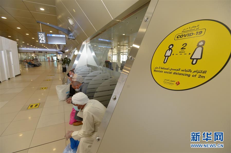 这是7月23日在科威特费尔瓦尼耶省的科威特国际机场出发大厅拍摄的保持社交距离的标识。 科威特将从8月1日起分三个阶段逐步放开国际商业航班,每个阶段持续6个月:第一阶段将恢复30%的运力,第二阶段恢复到60%,直到最后全面运营。另外,任何抵达或离开科威特的人必须持有新冠病毒核酸检测阴性证明。 新华社发(阿萨德 摄)