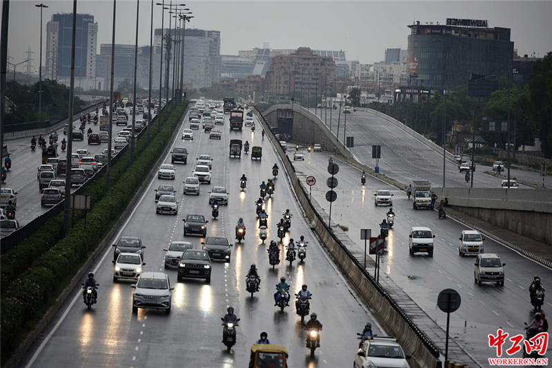 当地时间2020年7月24日,印度诺伊达,当地迎来降雨天气,街道积水。