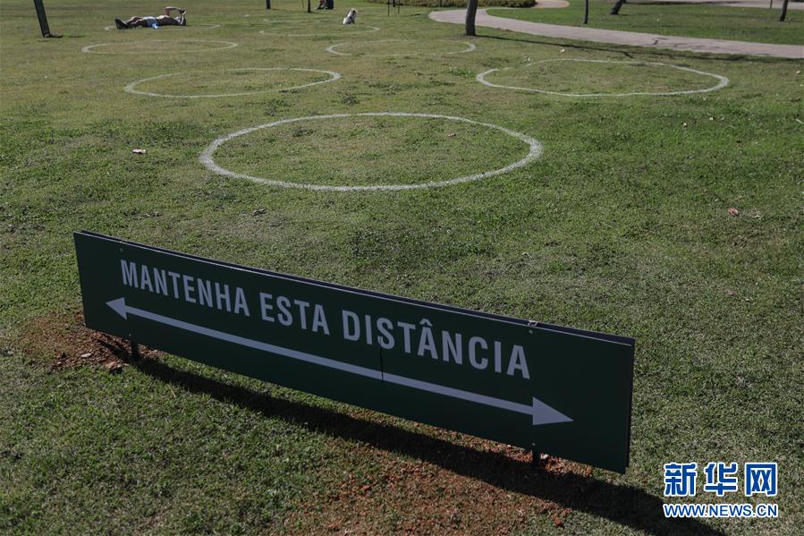 7月24日,巴西圣保罗市一处公园草坪上画着提醒人们保持安全距离的圆圈。 为了民众在疫情期间保持安全社交距离,巴西圣保罗市一些公园的草坪上画上了圆圈,提示民众待在圈内休闲。 新华社发(拉赫尔·帕特拉索摄)