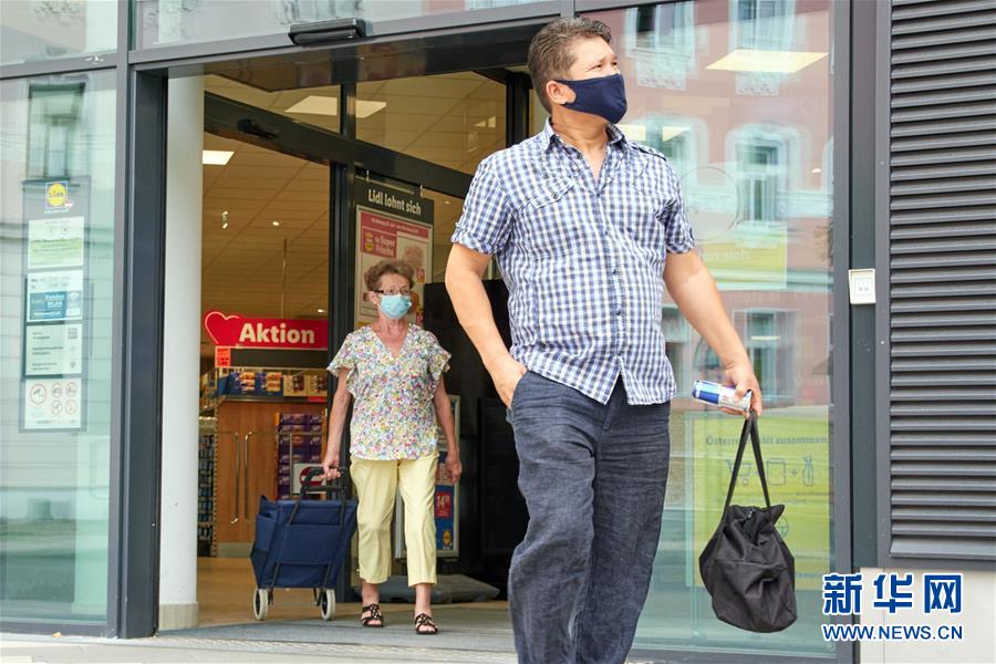 7月24日,戴口罩的顾客走出奥地利维也纳的一家超市。 新华社发(乔治斯·施耐德 摄)