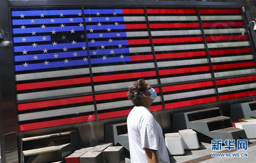 7月23日,在美国纽约时报广场,一名戴口罩的行人走在街头。