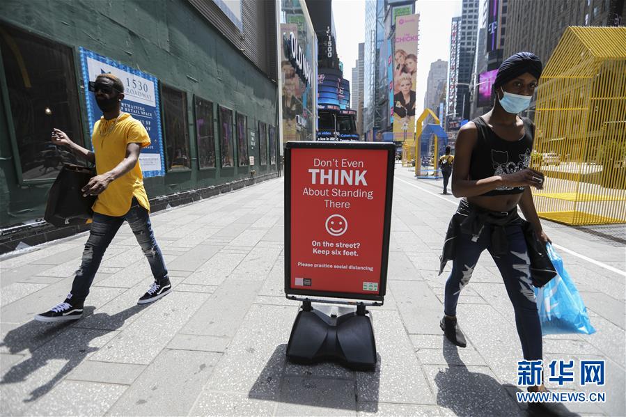7月23日,在美国纽约时报广场,人们从保持社交距离的提示牌旁走过。