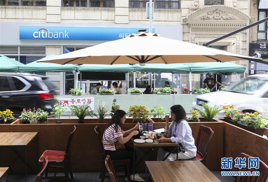 7月23日,在美国纽约,人们在户外就餐区用餐。