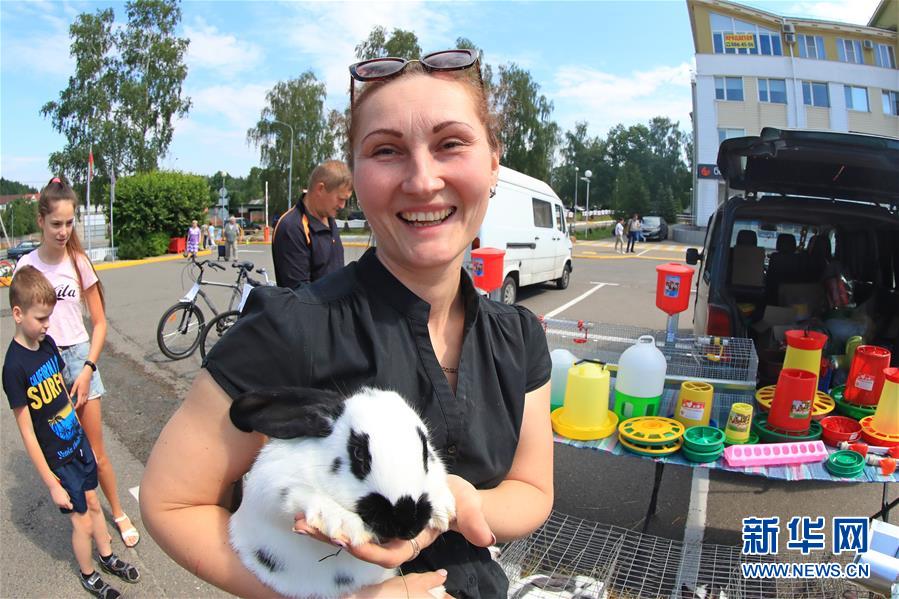 7月25日,在白俄罗斯首都明斯克郊区,一名女士展示在农贸节上买到的兔子。 当日,白俄罗斯举办农贸节,旨在吸引人们关注本国农业发展。 新华社发(任科夫 摄)