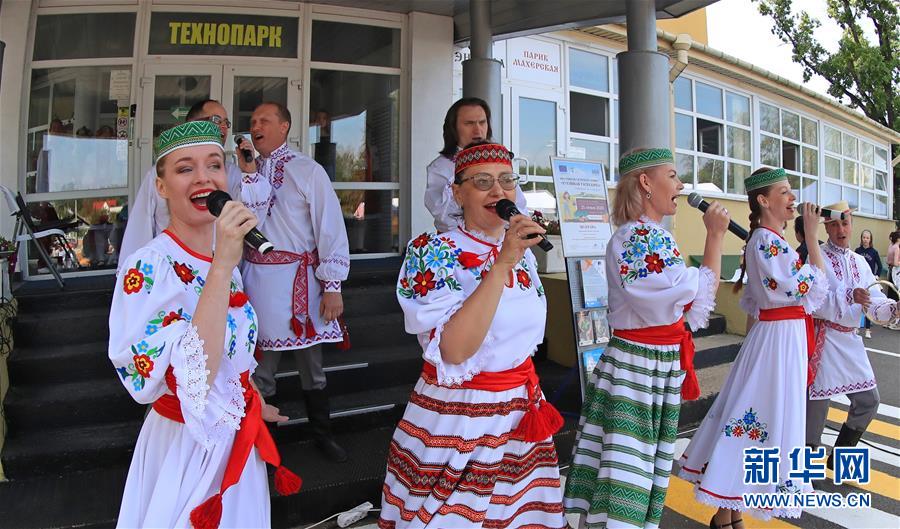 7月25日,在白俄罗斯首都明斯克郊区,身着民族服装的人们在农贸节上演唱歌曲。 当日,白俄罗斯举办农贸节,旨在吸引人们关注本国农业发展。 新华社发(任科夫 摄)