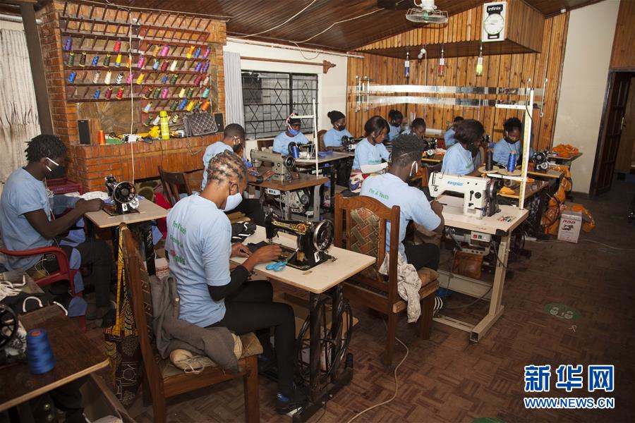 7月24日,在赞比亚首都卢萨卡的一家口罩生产厂,工人用缝纫机制作可水洗口罩。新华社发(马丁·姆班圭塔摄)