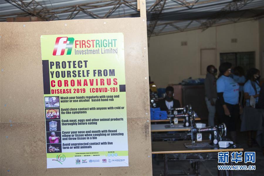 这是7月24日在赞比亚首都卢萨卡一家口罩生产厂拍摄的防疫宣传海报。新华社发(马丁·姆班圭塔摄)