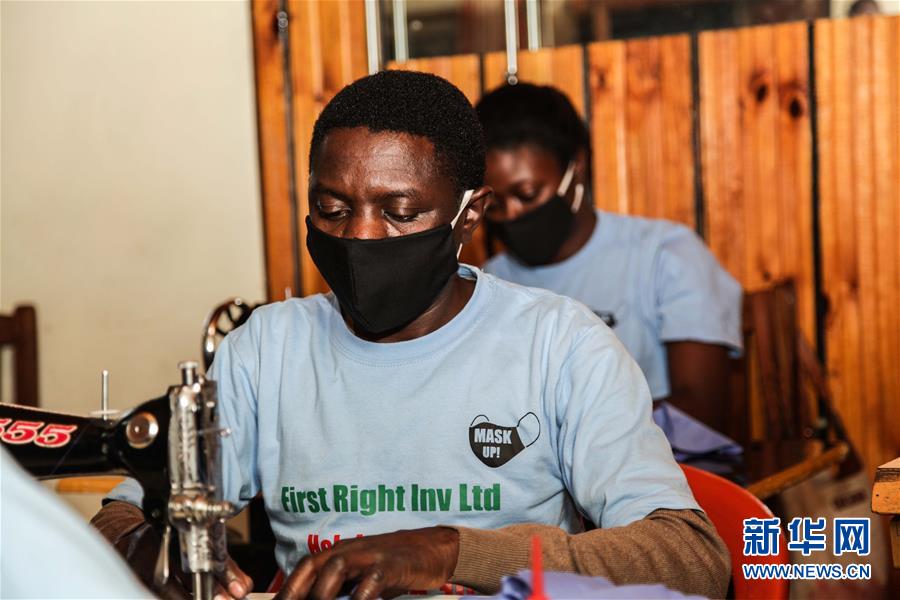 7月24日,在赞比亚首都卢萨卡的一家口罩生产厂,工人用缝纫机制作可水洗口罩。新华社发(马丁·姆班圭塔摄)