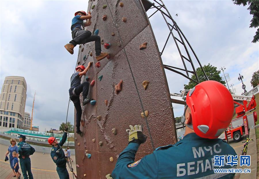 7月25日,在白俄罗斯首都明斯克,人们在消防员的帮助下体验攀岩。 白俄罗斯首都明斯克当天举行消防日活动,消防部门展示多种救灾救援技能。 新华社发(任科夫摄)