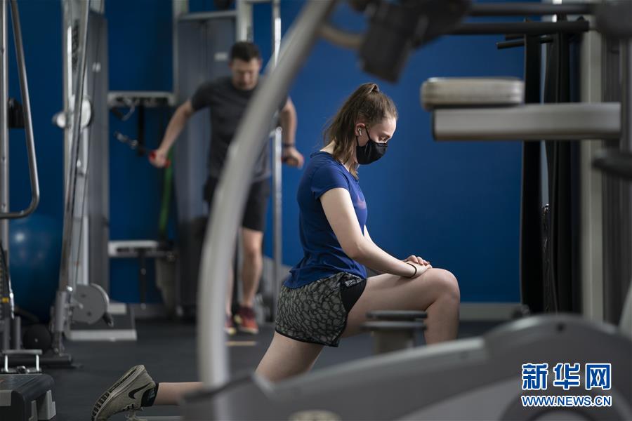 7月25日,在英国曼彻斯特,一名戴口罩的女子在健身中心健身。 按英国政府计划,从7月25日开始,英格兰地区室内健身场馆、游泳池等重新开放。 新华社发(乔恩·休珀摄)