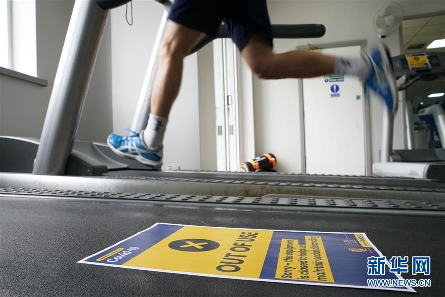 7月25日,在英国曼彻斯特的一家健身中心,跑步机上贴有因保持安全距离暂停使用的标志。 按英国政府计划,从7月25日开始,英格兰地区室内健身场馆、游泳池等重新开放。 新华社发(乔恩·休珀摄)