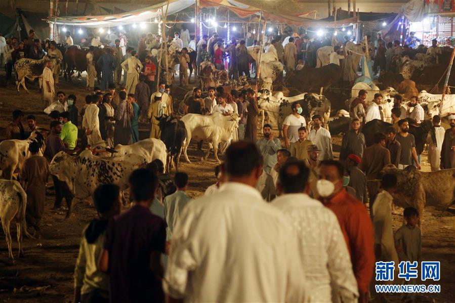 7月25日,在宰牲节来临之际,人们在巴基斯坦伊斯兰堡的一个牲畜市场挑选牛。 新华社发(艾哈迈德·卡迈勒摄)