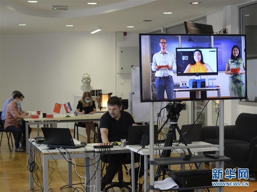 7月25日,在克罗地亚首都萨格勒布,评委通过视频观看选手参加“汉语桥”比赛。 第19届“汉语桥”世界大学生中文比赛和第13届“汉语桥”世界中学生中文比赛克罗地亚赛区比赛当日在萨格勒布举行。受新冠疫情影响,14名学生通过视频连线方式参加了比赛。 新华社记者 高磊摄