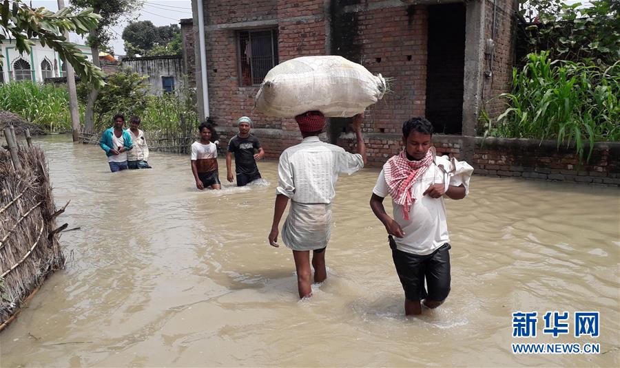 7月26日,人们在印度比哈尔邦穆扎法尔布尔涉水行走。 印度东北部比哈尔邦灾害管理部门26日发表公报说,该邦近日遭洪灾袭击,造成至少10人死亡、近150万人受灾。 新华社发