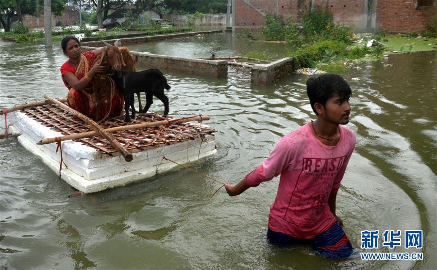 7月26日,在印度比哈尔邦穆扎法尔布尔,一名男青年使用简易漂浮物运送母亲出行。 印度东北部比哈尔邦灾害管理部门26日发表公报说,该邦近日遭洪灾袭击,造成至少10人死亡、近150万人受灾。 新华社发