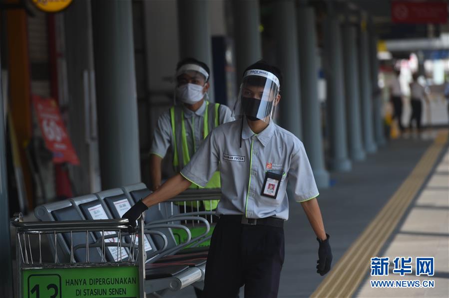 7月27日,工作人员佩戴防护面罩和口罩在印度尼西亚雅加达的一个火车站工作。 印度尼西亚国家抗灾署27日发布的新冠疫情数据显示,该国确诊病例比前一天增加1525例,累计确诊100303例;累计死亡4838例;累计治愈58173例。 新华社发(祖卡南摄)