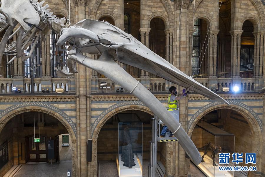 7月27日,工作人员在英国伦敦的自然历史博物馆大厅内清洁一具蓝鲸骨架。 受新冠疫情影响关闭数月的英国自然历史博物馆将于8月5日重新对外开放,目前馆方正在为重新开放做最后准备。参观者需要提前预约参观时段、全程佩戴口罩且保持安全距离。 新华社记者 韩岩 摄