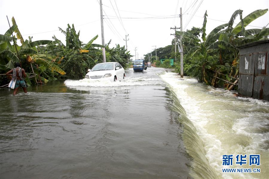7月27日,在孟加拉国首都达卡附近的蒙希甘杰,车辆通过被洪水淹没的路段。 南亚多国正在遭受近年来最严重的一次洪水袭击。 新华社发