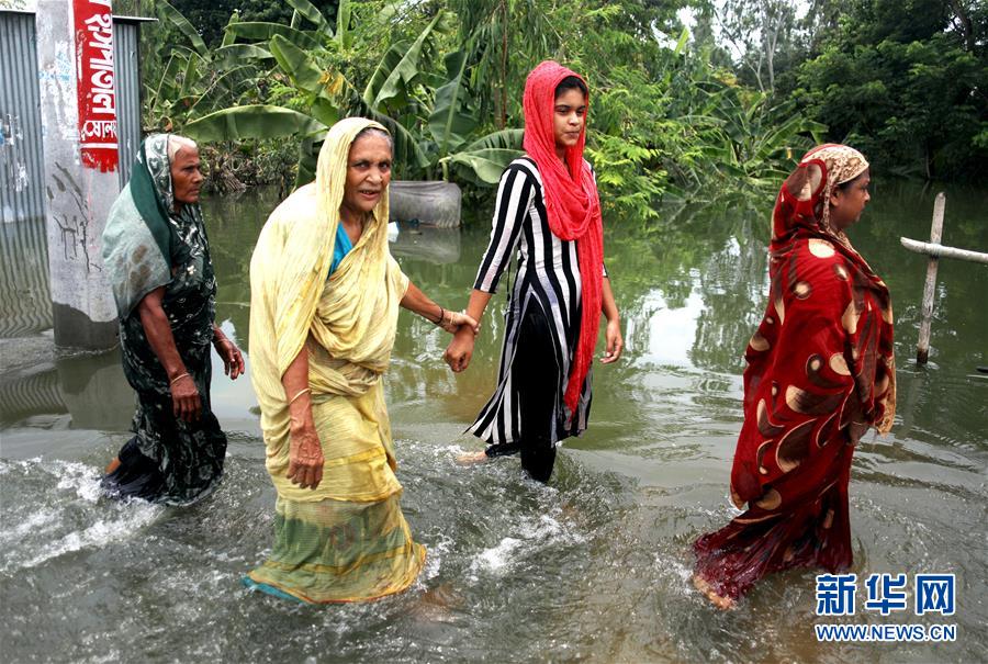 7月27日,在孟加拉国首都达卡附近的蒙希甘杰,妇女们涉水出行。 南亚多国正在遭受近年来最严重的一次洪水袭击。 新华社发