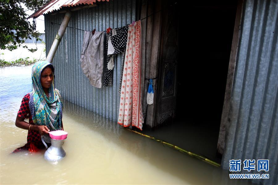 7月27日,在孟加拉国首都达卡附近的蒙希甘杰,一名妇女站在被洪水浸泡的房屋前。 南亚多国正在遭受近年来最严重的一次洪水袭击。 新华社发