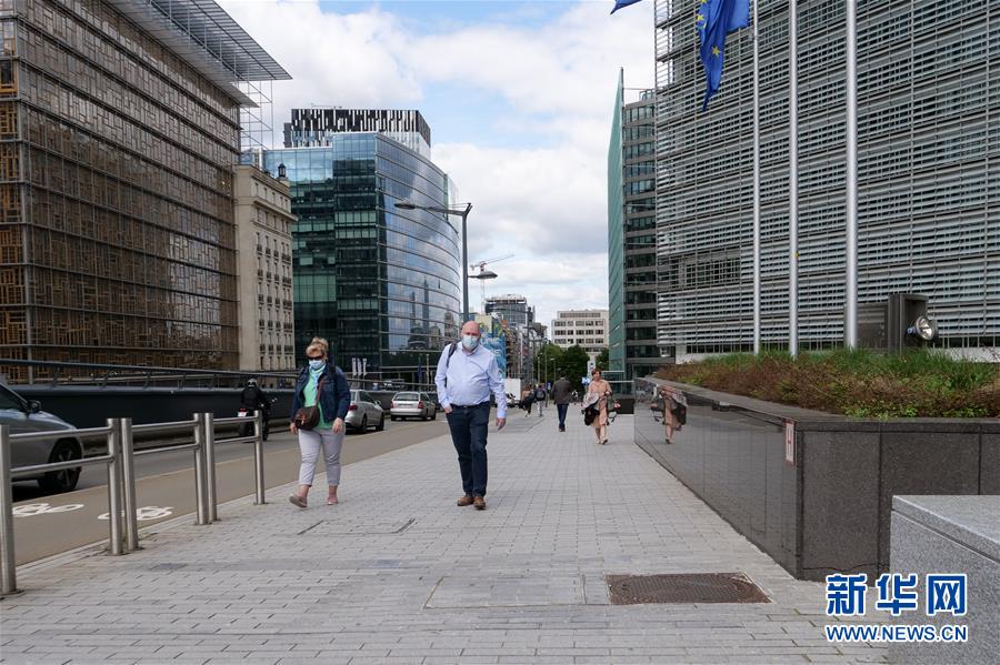 7月29日,在比利时布鲁塞尔,戴口罩的行人经过欧盟委员会总部大楼。 新华社记者 张铖 摄
