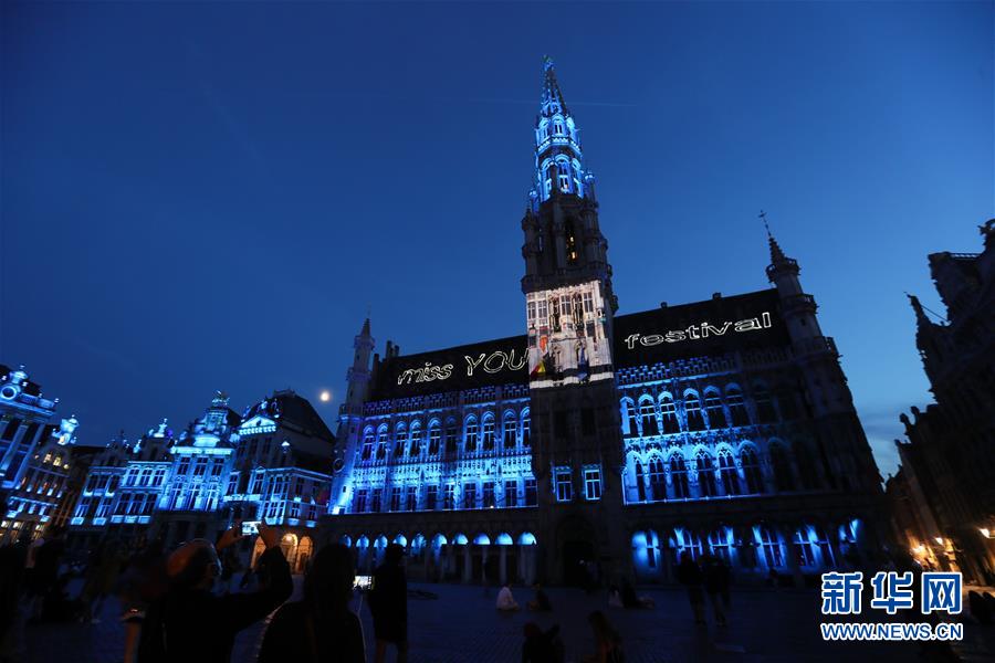 7月29日,比利时布鲁塞尔大广场的市政厅外墙上投射出“想念你,节日”的字样。 7月29日,比利时布鲁塞尔大广场举行大型声光秀。艺术家在市政厅等历史建筑上投影文字和图案,纪念这个夏天受新冠疫情影响而不能如期举办的文化活动。 新华社记者 郑焕松 摄