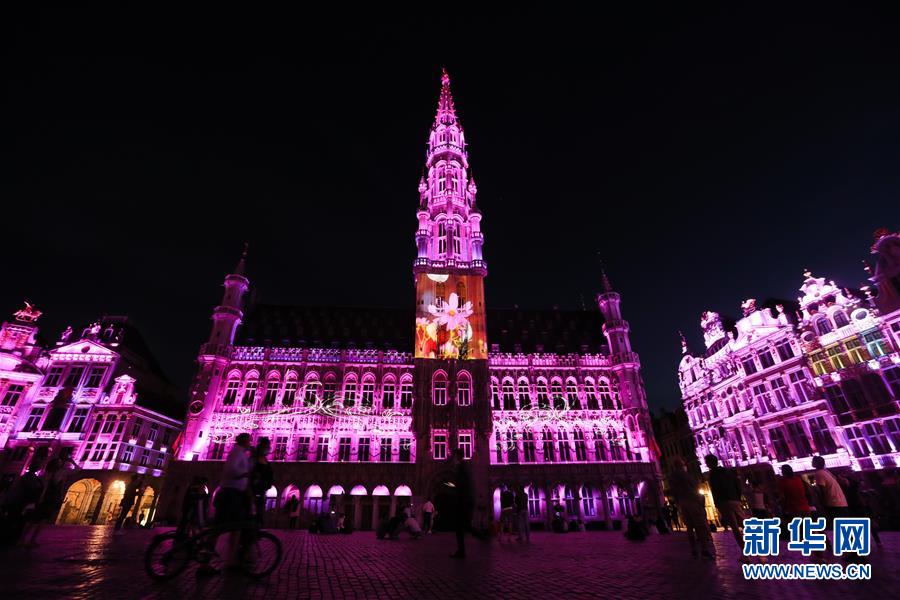 7月29日,人们在比利时布鲁塞尔大广场欣赏声光秀,市政厅外墙上投射出鲜花地毯主题的图案。 7月29日,比利时布鲁塞尔大广场举行大型声光秀。艺术家在市政厅等历史建筑上投影文字和图案,纪念这个夏天受新冠疫情影响而不能如期举办的文化活动。 新华社记者 郑焕松 摄