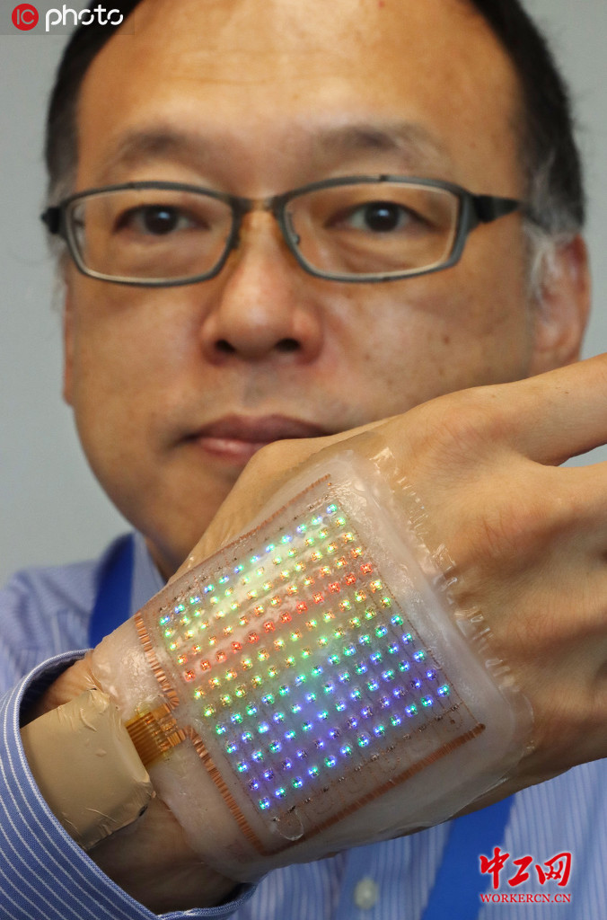当地时间2020年7月28日,日本东京,日本知名印刷公司大日本印刷株式会社的研究人员Hiroki Maeda展示可贴在皮肤上的显示屏。据悉,这款显示屏的形状为正方形,其厚度仅有2毫毫米,屏幕下配备LED芯片,屏幕整体可以实现伸缩,如同胶片一样。据悉,这款显示器可以用于接收智能手机等移动设备传来的图像数据,并显示内容,让用户可以在不借助手机的情况下阅读信息及掌握自身健康状况等。这款可以贴在皮肤上的彩色显示屏由大日本印刷株式会社和东京大学教授Takao Someya合作研发。