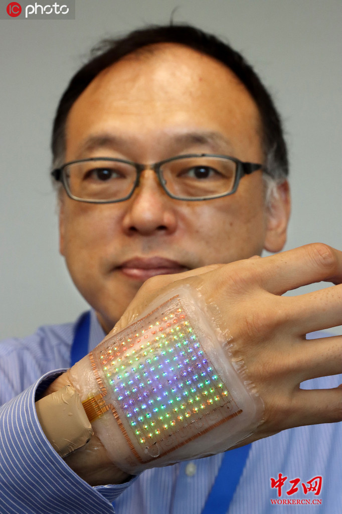 当地时间2020年7月28日,日本东京,日本知名印刷公司大日本印刷株式会社的研究人员Hiroki Maeda展示可贴在皮肤上的显示屏。据悉,这款显示屏的形状为正方形,其厚度仅有2毫毫米,屏幕下配备LED芯片,屏幕整体可以实现伸缩,如同胶片一样。据悉,这款显示器可以用于接收智能手机等移动设备传来的图像数据,并显示内容,让用户可以在不借助手机的情况下阅读信息及掌握自身健康状况等。这款可以贴在皮肤上的彩色显示屏由大日本印刷株式会社和东京大学教授Takao Someya合作研发。