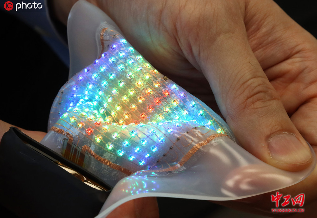当地时间2020年7月28日,日本东京,日本知名印刷公司大日本印刷株式会社的研究人员Hiroki Maeda展示可贴在皮肤上的显示屏。据悉,这款显示屏的形状为正方形,其厚度仅有2毫毫米,屏幕下配备LED芯片,屏幕整体可以实现伸缩,如同胶片一样。据悉,这款显示器可以用于接收智能手机等移动设备传来的图像数据,并显示内容,让用户可以在不借助手机的情况下阅读信息及掌握自身健康状况等。这款可以贴在皮肤上的彩色显示屏由大日本印刷株式会社和东京大学教授Takao Someya合作研发。