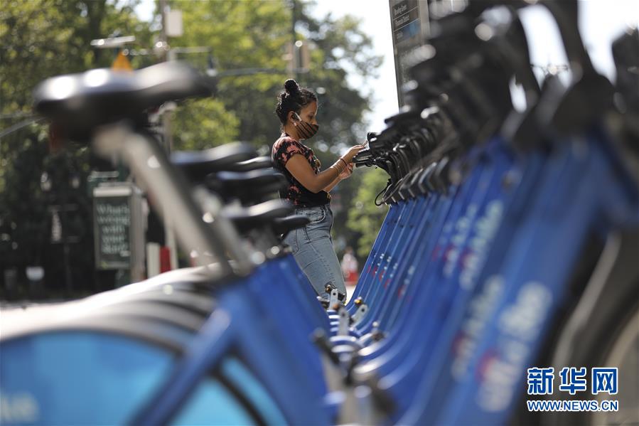 7月29日,在美国纽约,一名女子准备取用共享单车。 美国约翰斯·霍普金斯大学实时统计数据显示,截至29日,美国累计新冠确诊病例已超过440万例,累计死亡病例超过15万例。 新华社记者 王迎 摄