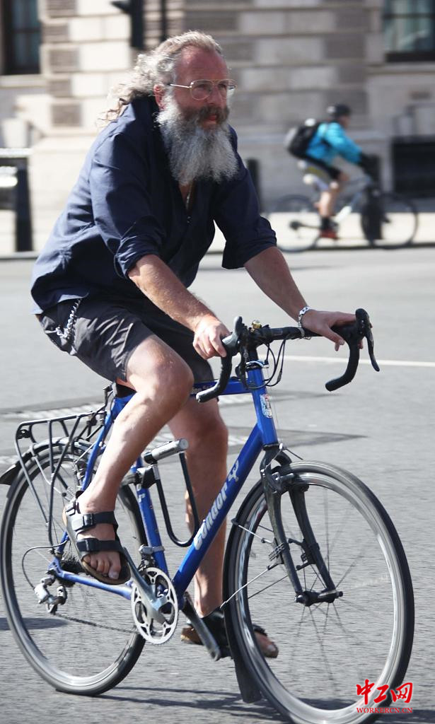 当地时间2020年7月29日,英国伦敦,在英国首相鲍里斯·约翰逊于本周向民众宣布免费发放“50镑自行车维修代金券”计划后,伦敦大街小巷兴起“自行车骑行热”。图为拖家带口的骑行者。 张平(英国分社)/中新社