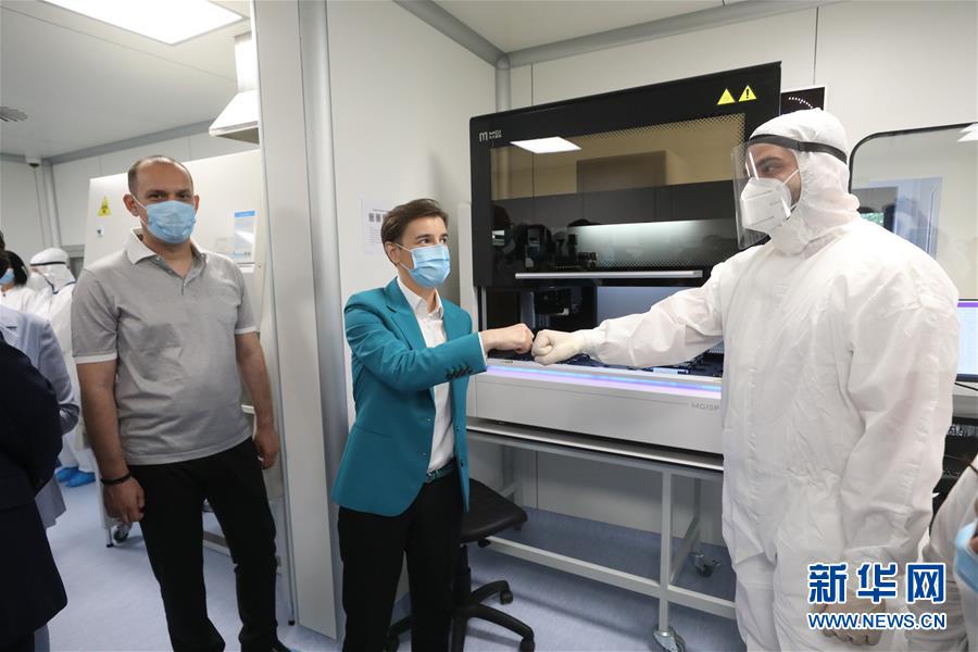 7月30日,在塞尔维亚南部城市尼什,塞尔维亚总理布尔纳比奇(中)视察新落成的“火眼”病毒检测实验室。 新华社发(塞尔维亚政府供图)