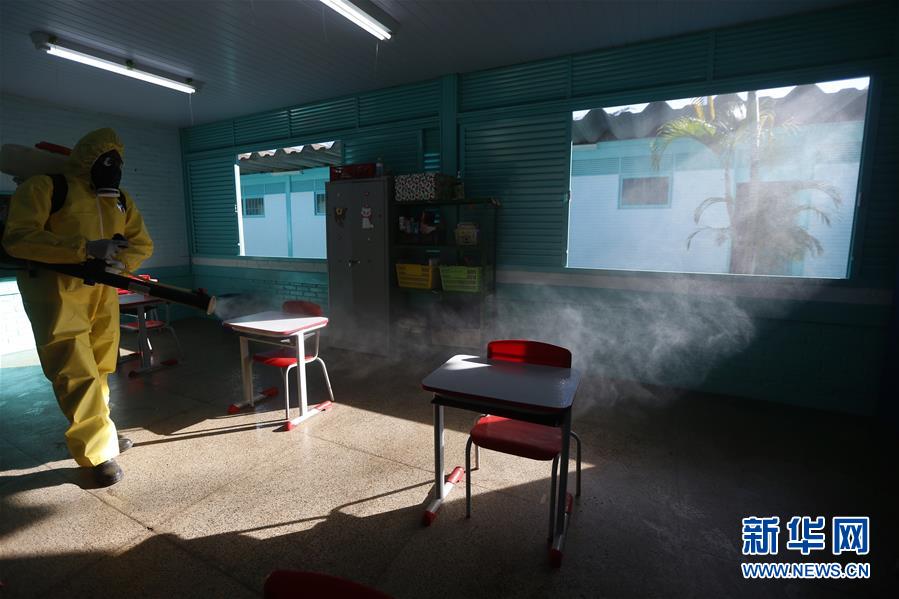 7月30日,工人在巴西首都巴西利亚为公立学校的教室消毒。当地公立学校处于停课状态,复课时间尚待确定。 目前,巴西的累计确诊和死亡病例数均位列全球第二,仅次于美国。 新华社发(卢西奥·塔沃拉摄)