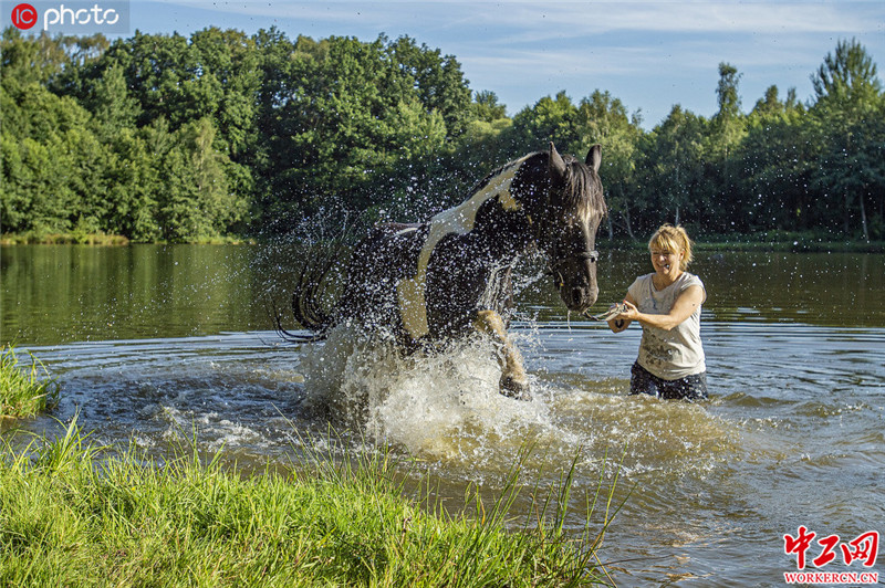 当地时间2020年7月30日,捷克利贝雷茨州赫拉斯塔瓦,天气炎热,几名女子带着马儿在池塘里玩耍。IC photo