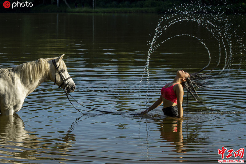 当地时间2020年7月30日,捷克利贝雷茨州赫拉斯塔瓦,天气炎热,几名女子带着马儿在池塘里玩耍。IC photo