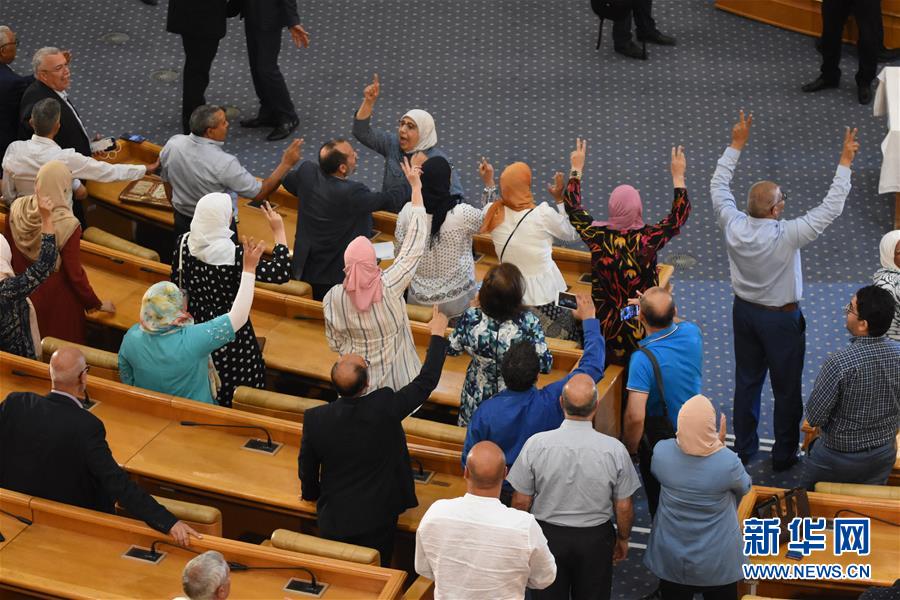 7月30日,突尼斯议长拉希德·加努希的支持者在突尼斯议会庆祝针对加努希的不信任案被否决。 突尼斯议会30日举行投票,否决了针对议长拉希德·加努希的不信任案。当天共有133名议员参与不信任案投票,其中97票赞同、16票反对。由于赞同票未达到宪法规定的票数,加努希继续担任议长。 新华社发 (阿代尔摄)