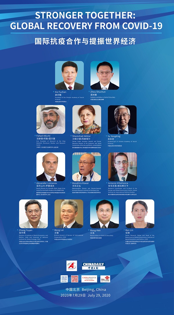 中国日报7月30日电 北京时间7月29日晚,由中国社会科学院、中国日报社主办的“国际抗疫合作与提振世界经济”国际智库云论坛在中国历史研究院举行,来自世界顶尖智库的6位专家学者通过视频连线,就深化国际合作、构建人类卫生健康共同体、维护经济全球化、促进世界经济发展深入交流,建言献策,达成了许多共识。