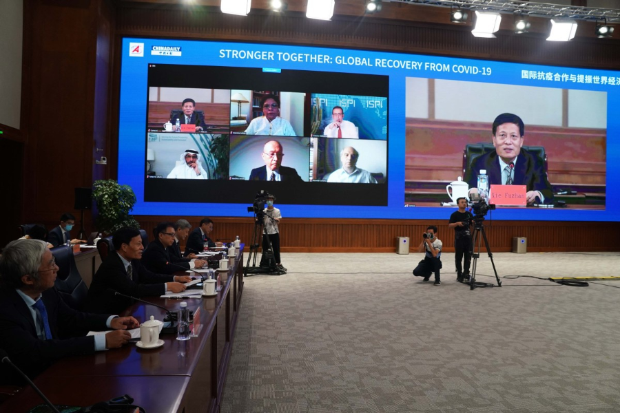7月29日晚,中国社会科学院院长谢伏瞻在“国际抗疫合作与提振世界经济”云论坛开幕式上致辞。 中国日报记者 冯永斌 摄