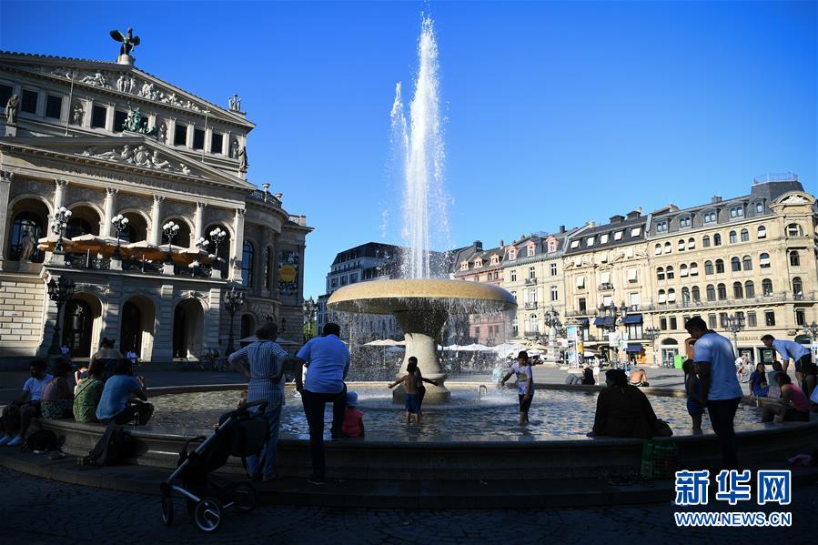 7月31日,人们在位于德国法兰克福老歌剧院附近的一处喷泉内戏水乘凉。 当日,德国法兰克福遭遇高温天气,市中心最高气温达35摄氏度。 新华社记者 逯阳 摄