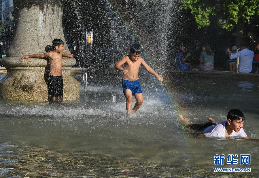 7月31日,孩子们在位于德国法兰克福老歌剧院附近的一处喷泉内戏水。 当日,德国法兰克福遭遇高温天气,市中心最高气温达35摄氏度。 新华社记者 逯阳 摄