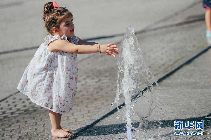 7月31日,在比利时布鲁塞尔,一名女孩在茹尔当广场戏水。 当日,比利时迎来高温天气,最高气温超过36摄氏度。 新华社记者 张铖 摄