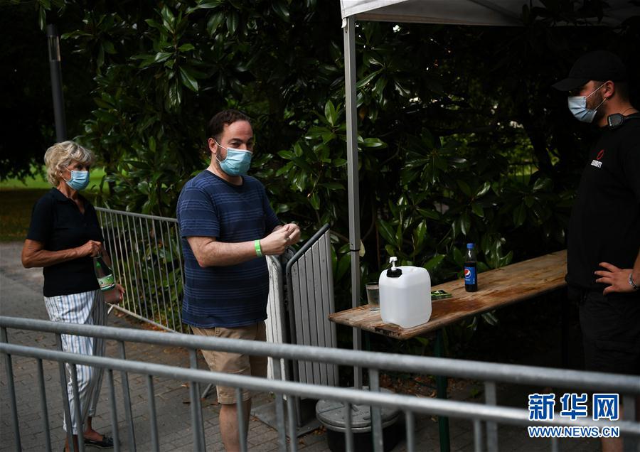 8月1日,人们在观看一场德国法兰克福棕榈园户外音乐会前洗手消毒。 新华社记者 逯阳 摄